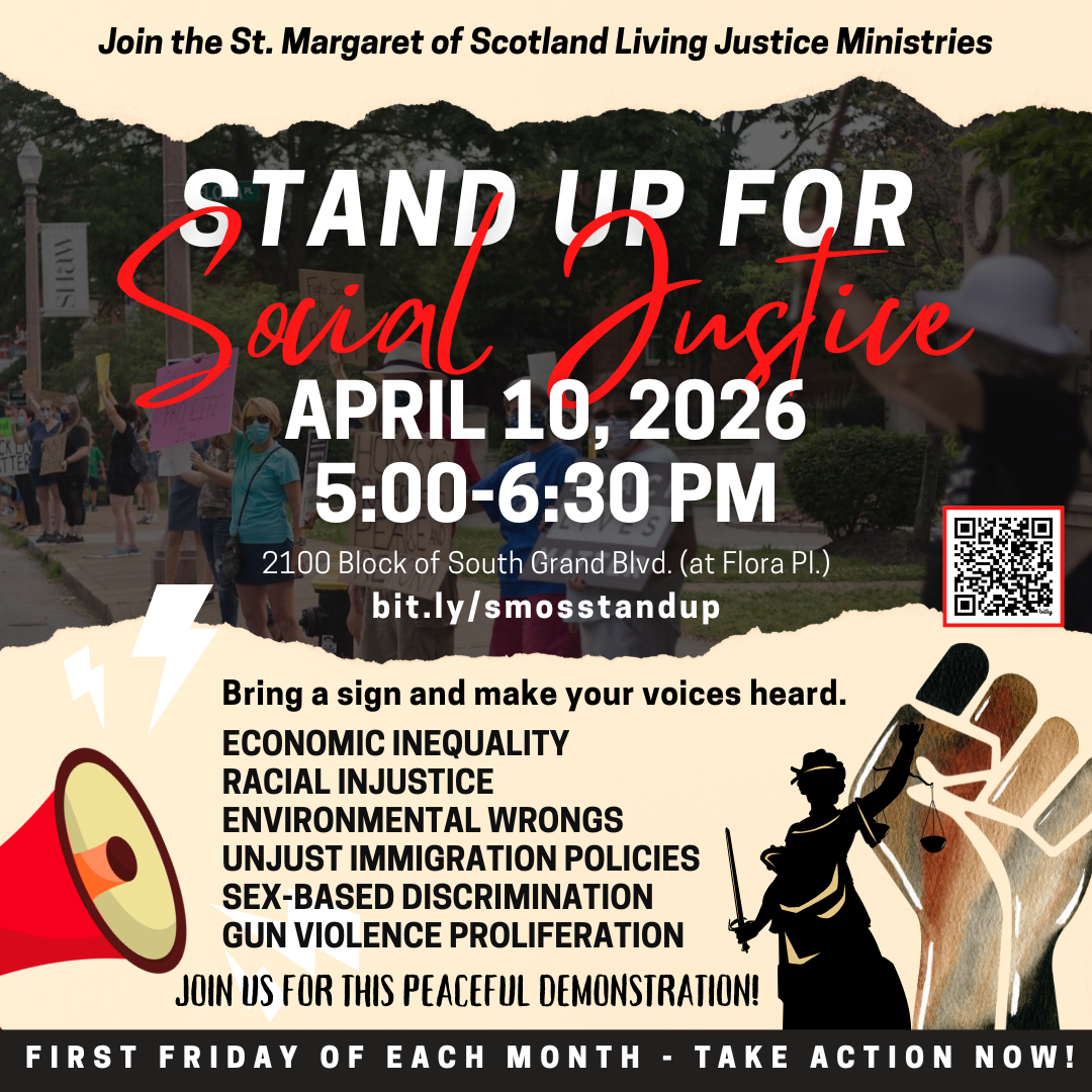 The SMOS Living Justice Ministries will once again be gathering during the month of April to voice our concerns for issues concerning peace and justice. The event is rain or shine – and we’re back to our Summer hours now that we’ve passed Daylight Savings Time. All are welcome to join!