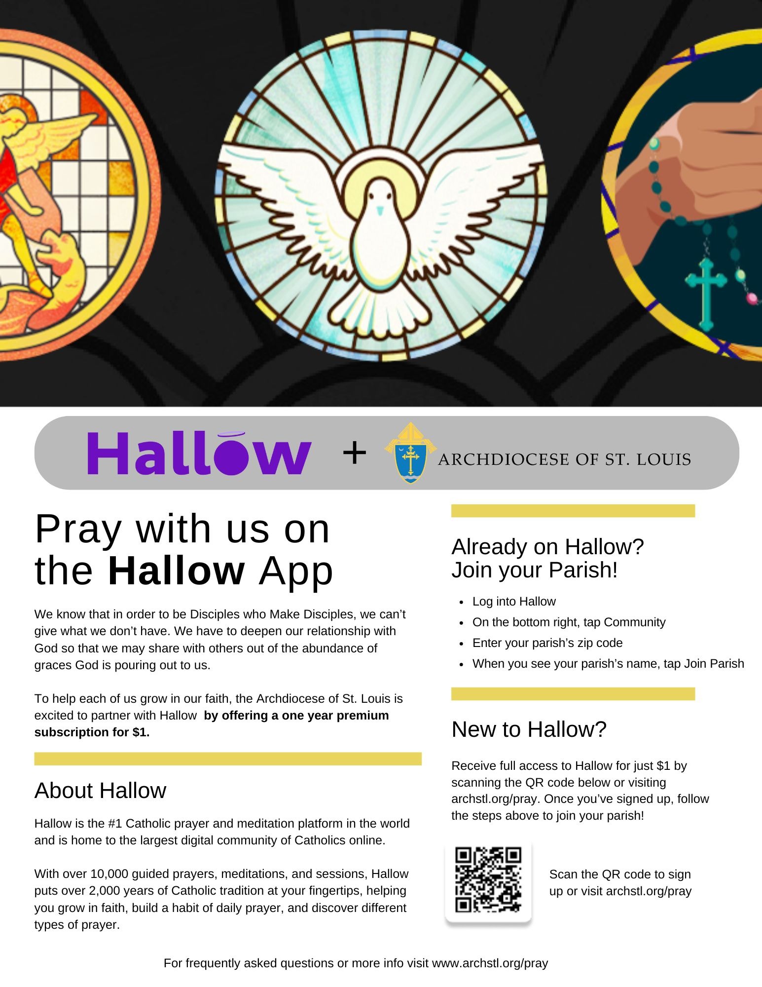Ready to join the challenge? Normally, Hallow has a monthly subscription fee (and only a 7-day trial), but the Archdiocese of St. Louis has put together a special offer for parishioners.
