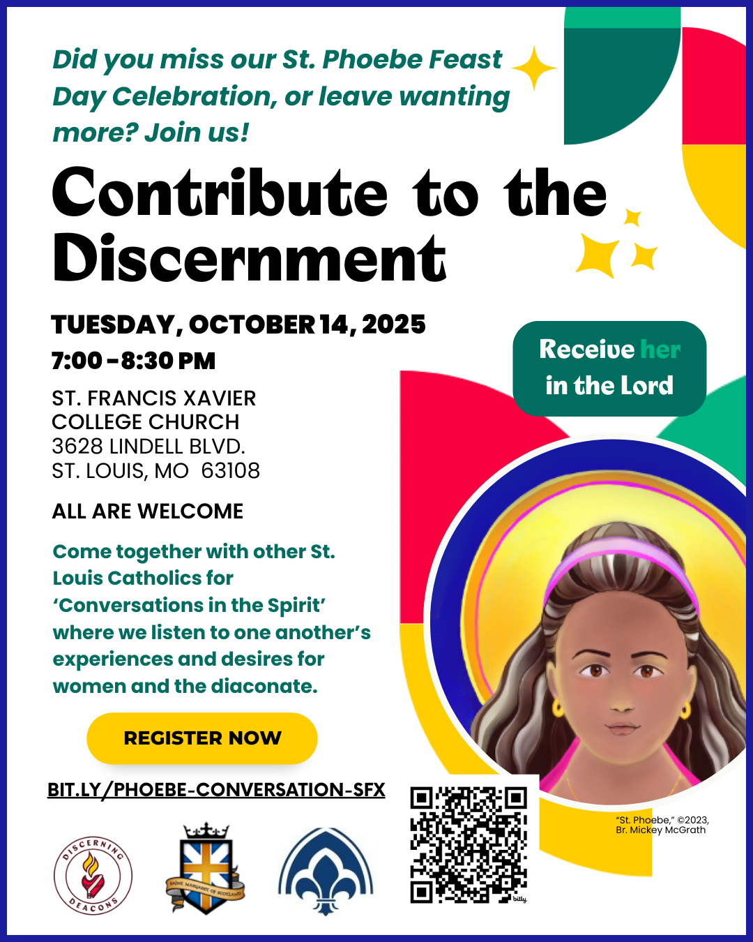If you attended the St. Phoebe Day Celebration this year and wish to continue the conversation or if you want to find out more information about women in the Church in general, then please join us on Tuesday, October 14 from 7-8:30pm at St. Francis Xavier College Church as we explore “Conversations In The Spirit”.