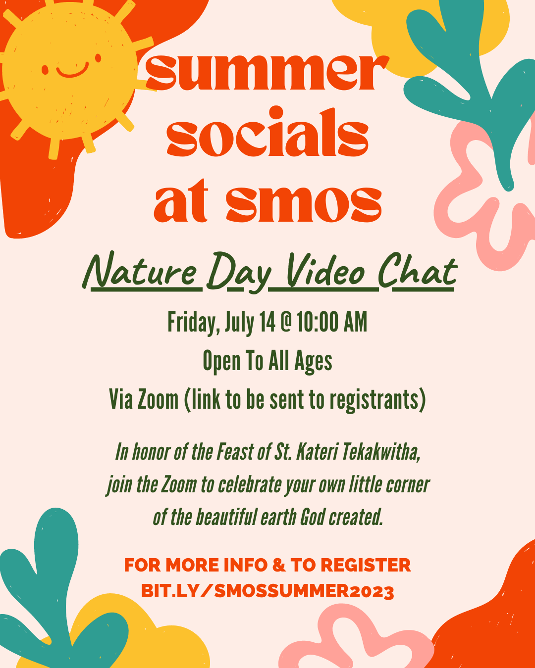 Call of the Wild!! In honor of the Feast of St. Kateri Tekakwitha (the first Native American saint), join Gwen Cataldo for a Zoom call where the children can show their own little corner of the beautiful earth God created. Each child will share about where they are currently located, discuss what kind of plants and wildlife they are experiencing there, and (with Gwen’s help) draw connections between what they see and where God is in relation.