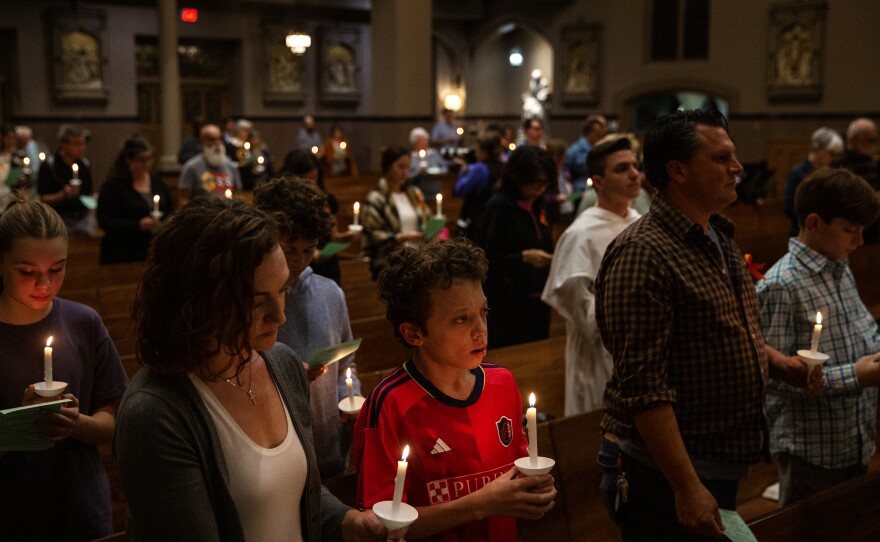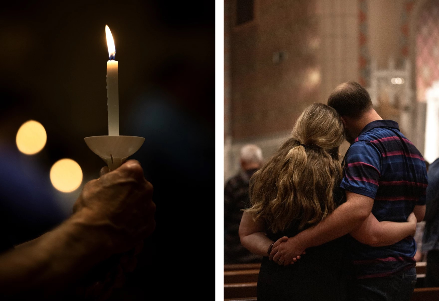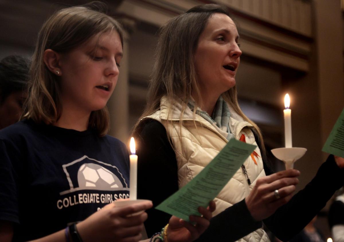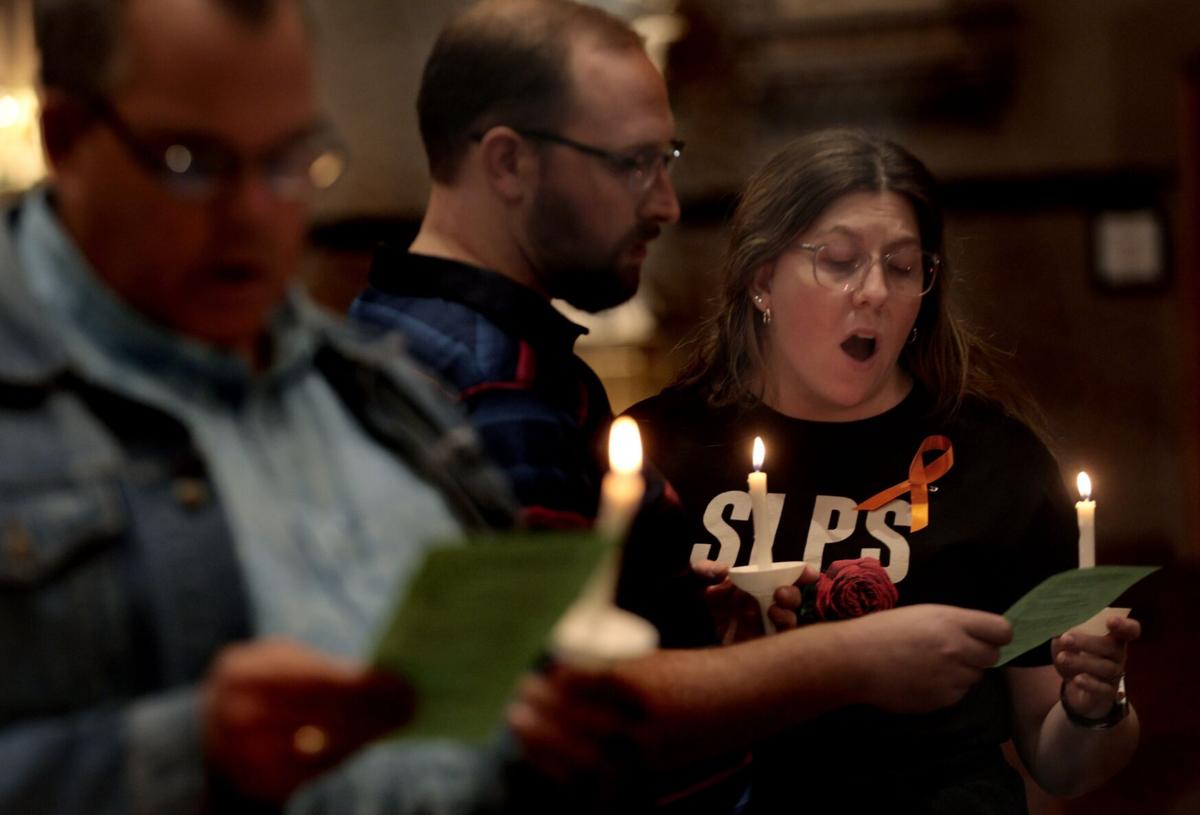 Tristen Rouse/St. Louis Public Radio – Community members hold a prayer vigil for the one-year anniversary of a shooting at a building shared by Central Visual and Performing Arts High School and Collegiate School of Medicine and Bioscience on Tuesday at St. Margaret of Scotland Catholic Church in the Shaw neighborhood of St. Louis.Tristen Rouse/St. Louis Public Radio – LEFT: A man holds a candle during a prayer vigil for the one-year anniversary of a shooting at a building shared by Central Visual and Performing Arts High School and Collegiate School of Medicine and Bioscience on Tuesday at St. Margaret of Scotland Catholic Church in the Shaw neighborhood of St. Louis. RIGHT: Two people embrace during the vigil.Tristen Rouse/St. Louis Public Radio – Collegiate School of Medicine and Bioscience student Molly Schiltz, left, and her mother, Emily, attend a prayer vigil for the one-year anniversary of a shooting at a building shared by Central Visual and Performing Arts High School and CSMB on Tuesday at St. Margaret of Scotland Catholic Church.Tristen Rouse/St. Louis Public Radio – A woman prays during a vigil for the one-year anniversary of a shooting at a building shared by Central Visual and Performing Arts High School and Collegiate School of Medicine and Bioscience on Tuesday at St. Margaret of Scotland Catholic Church.Tristen Rouse/St. Louis Public Radio – LEFT: Gloria Reed attends a prayer vigil for the one-year anniversary of a shooting at a building shared by Central Visual and Performing Arts High School and Collegiate School of Medicine and Bioscience on Tuesday at St. Margaret of Scotland Catholic Church in the Shaw neighborhood of St. Louis. RIGHT: A statue of a monk holding a baby at the church.Tristen Rouse/St. Louis Public Radio – Candles are lit from person to person during a prayer vigil for the one-year anniversary of a shooting at a building shared by Central Visual and Performing Arts High School and Collegiate School of Medicine and Bioscience on Tuesday at St. Margaret of Scotland Catholic Church in the Shaw neighborhood of St. Louis.Tristen Rouse/St. Louis Public Radio – Kathy Petersen, center, attends a prayer vigil for the one-year anniversary of a shooting at a building shared by Central Visual and Performing Arts High School and Collegiate School of Medicine and Bioscience on Tuesday at St. Margaret of Scotland Catholic Church in the Shaw neighborhood of St. Louis. Petersen is a member of the church’s task force on gun violence prevention.Tristen Rouse/St. Louis Public Radio – Community members hold a prayer vigil for the one-year anniversary of a school shooting at a building shared by Central Visual and Performing Arts High School and Collegiate School of Medicine and Bioscience on Tuesday at St. Margaret of Scotland Catholic Church in the Shaw neighborhood of St. Louis.Laurie Skrivan/Post-Dispatch – Emily Thiele, right, a teacher in the Mehlville School District, holds a candle of hope alongside her husband, Michael, at a public, nondenominational prayer vigil on Tuesday, Oct. 24, 2023, at St. Margaret of Scotland church in St. Louis on the one year anniversary of a shooting on the shared campus of Central Visual and Performing Arts High School and Collegiate School of Medicine & Bioscience in St. Louis. The 2022 shooting left two people dead and six wounded.Laurie Skrivan/Post-Dispatch – Molly Schiltz, 15, a sophomore at Collegiate School of Medicine and Bioscience lights a candle of hope alongside her mother, Emily, (right) at a public, non-denominational prayer vigil on Tuesday, Oct. 24, 2023, at St. Margaret of Scotland church in St. Louis, on the one year anniversary of a shooting at Central Visual and Performing Arts High School and Collegiate School of Medicine and Bioscience in St. Louis. The 2022 shooting at the two-school campus left two people dead and six wounded. Photo by Laurie Skrivan, lskrivan@post-dispatch.comLaurie Skrivan/Post-Dispatch – “My granddaughter is a teacher there. I bought this t-shirt last year in support,” said John Merideth, who attends a public, non-denominational prayer vigil on Tuesday, Oct. 24, 2023, at St. Margaret of Scotland church in St. Louis, on the one year anniversary of a shooting at Central Visual and Performing Arts High School and Collegiate School of Medicine and Bioscience in St. Louis. The 2022 shooting at the two-school campus left two people dead and six wounded. Photo by Laurie Skrivan, lskrivan@post-dispatch.com