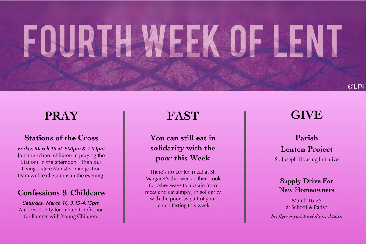 We continue with our prayer, fasting, and giving for the Season of Lent. Here are the activities planned for the fourth week.