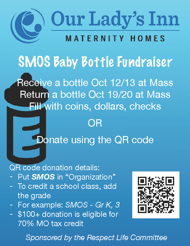 Bottles will be passed out next weekend (Oct 12/13) at all Masses. Please take yours home, fill it with coins, dollars, or checks and return it the weekend of Oct 19/20. You can also donate at any time via the link below. Be sure to indicate St. Margaret of Scotland in the organization line. Donations of $100 or more are eligible for a 70% Missouri Tax Credit, meaning your donation of $100 will directly decrease your Missouri tax liability by $70. This allows you to provide $100 to Our Lady’s Inn at an out-of-pocket cost of just $30. Thank you for your generosity!