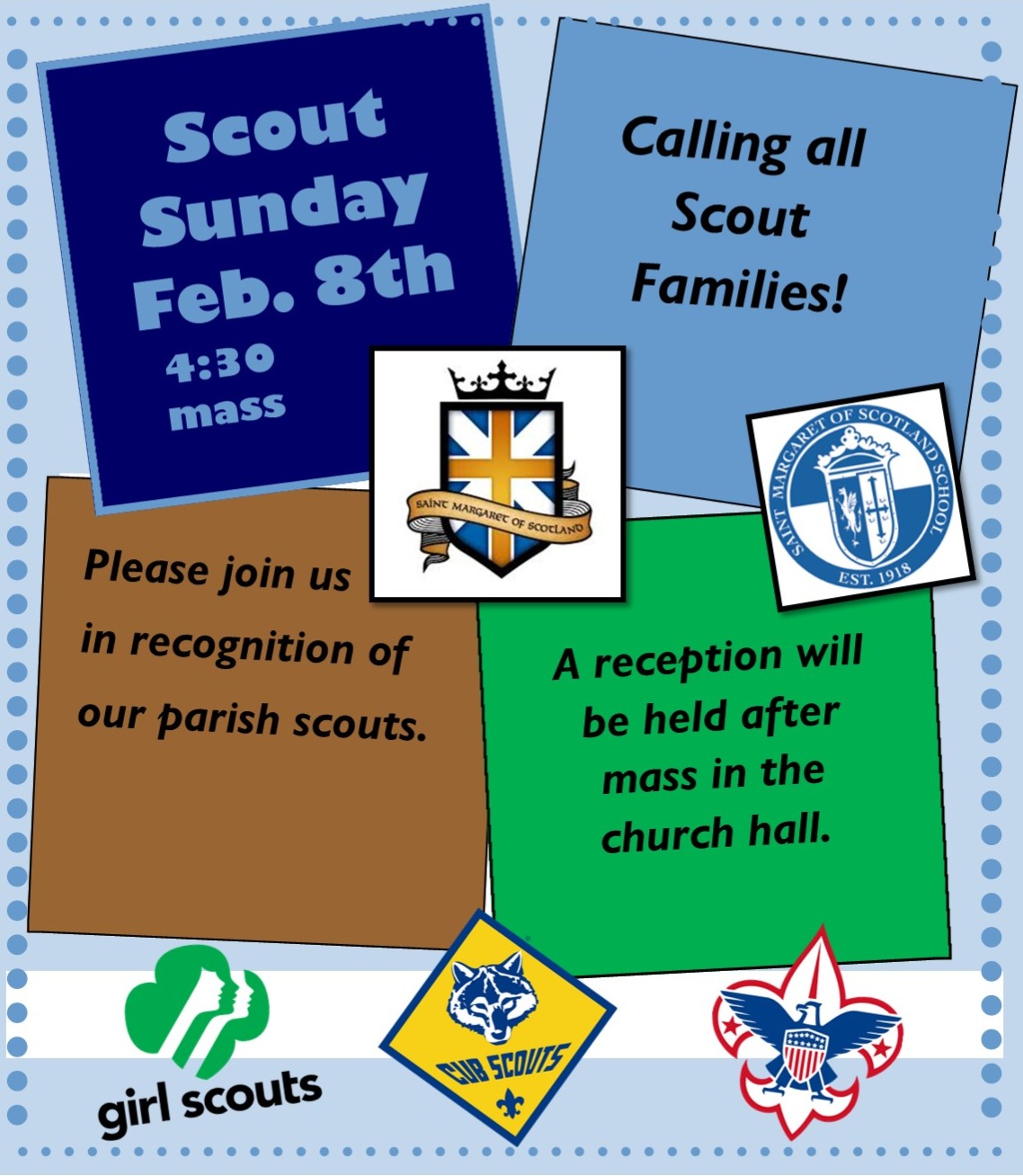 Please join us in recognition of our parish scouts at the 4:30pm Mass on Saturday, February 8. A reception will be held after the Mass in the Church Hall.