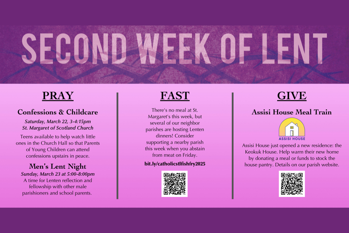 There’s no meal at St. Margaret’s this week, but several of our neighbor parishes are hosting Lenten dinners! Consider supporting a nearby parish this week when you abstain from meat on Friday.
