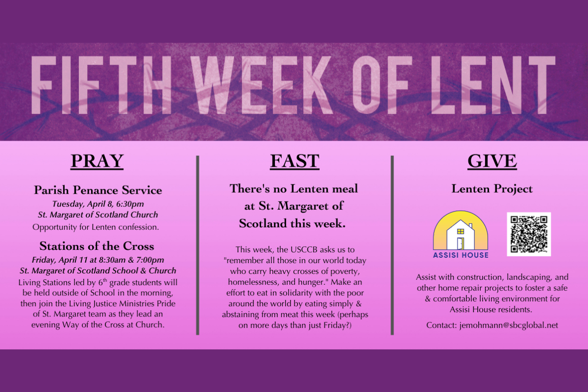 We continue with our prayer, fasting, and giving for the Season of Lent. Here are the activities planned for this fifth full week.