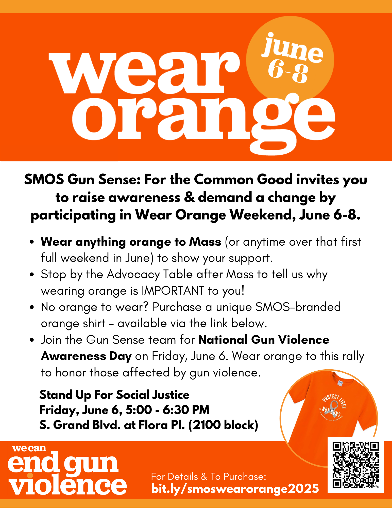 The SMOS Gun Sense: For the Common Good team invites you to wear your orange shirts to honor survivors and victims of gun violence and call for a future free from this crisis. Wear orange to raise awareness and show your concern! Wear orange to Mass to pray for all of us affected.