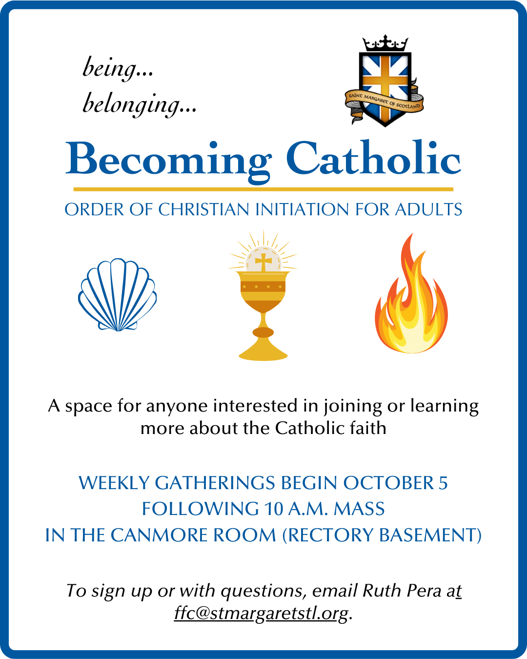 Ruth Pera and the ‘Becoming Catholic’ Team are available the next several weeks as well, if you have questions or comments. They’d love to hear about your faith journey and answer any questions you have about Catholicism, Becoming Catholic, or our community here at St. Margaret’s!