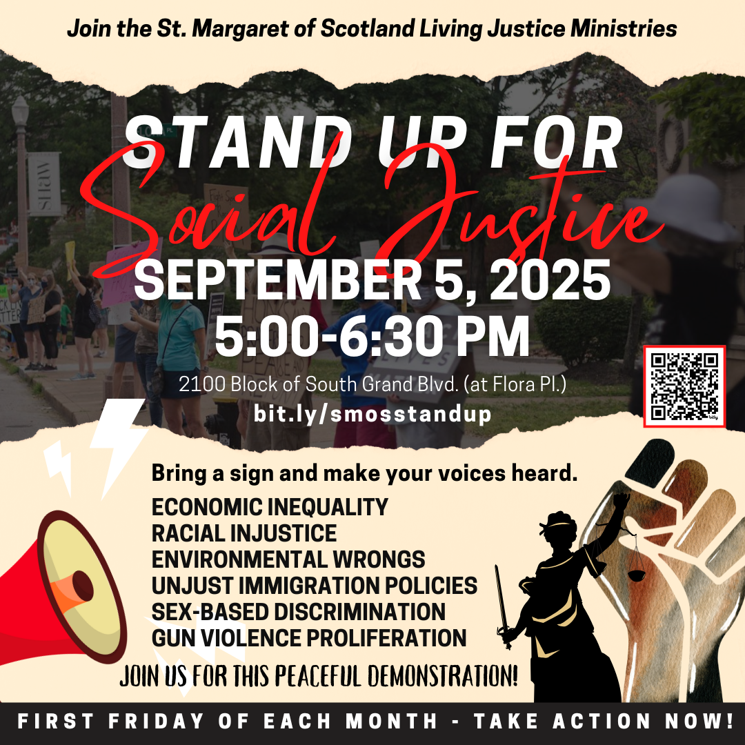 St. Margaret of Scotland has been a cornerstone of the Catholic faith in the Shaw neighborhood of South St. Louis, MO since 1899. The SMOS Living Justice Ministries, in keeping with the parish mission, is dedicated to imbuing the parish – individuals and organizations – with an awareness of what it means to live just lives, and to encourage each – personally and collectively – to work towards a more just society to benefit the parish, our city and the greater community. The five teams that make up the LJM are: Care For Creation (environment), Gun Sense: For the Common Good (gun violence prevention), Immigration, Pride of St. Margaret (LGBTQ+ rights), and Racial Equity.