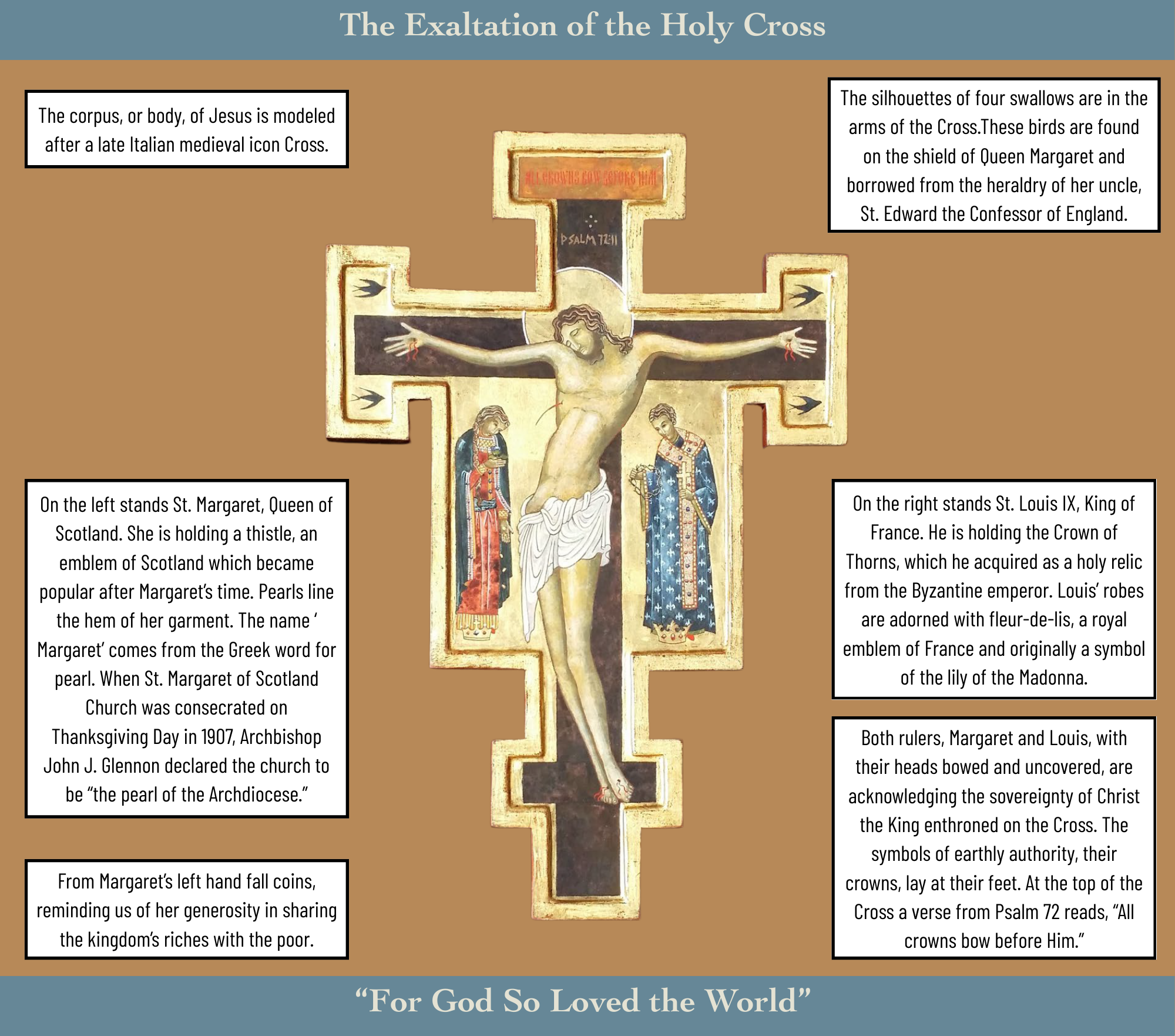 At every Sunday Mass, a Cross of Christ leads our entrance procession. As you may know, earlier this summer, we started using the “Cross of Crowns” as our processional cross. This cross was donated by our Ladies Auxiliary and was painted by an anonymous parishioner during the time of Fr. O’Toole. Our parishioner Dave Reid recently adapted this cross to our existing pole and stand. It beautifully depicts the crucified Christ being honored by St. Louis of France and St. Margaret of Scotland, two earthly rulers who lay their own crowns before the crucified Lord. You are welcome to come into the sanctuary anytime to get a closer look!