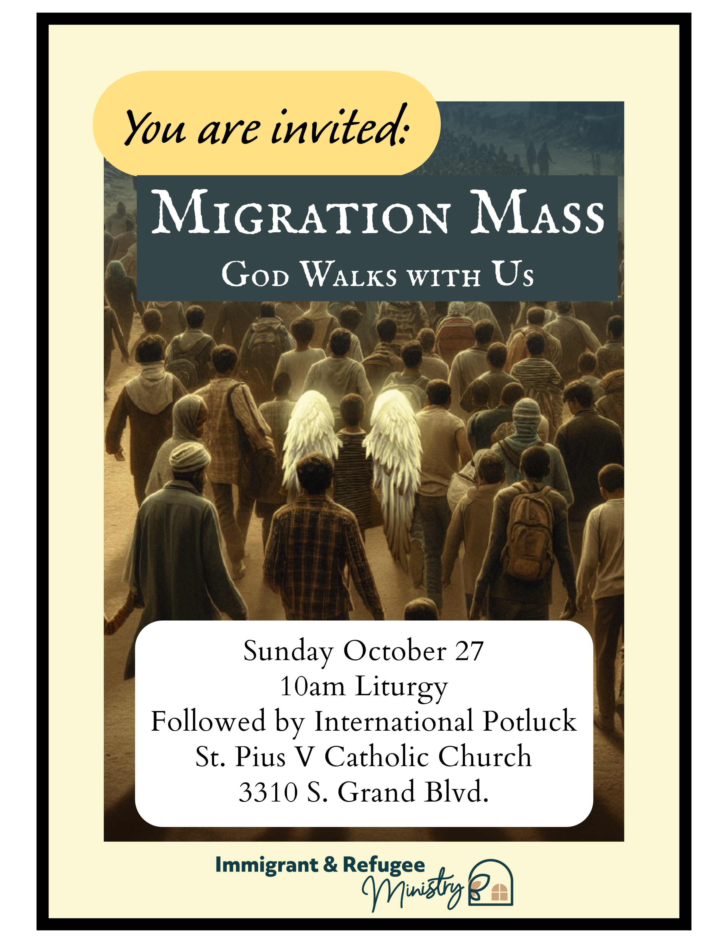 To honor the rich contributions of migrants to our Church, St. Pius V Parish community invites you to join the celebration of the annual Migration Mass at 10:00 am on Sunday, October 27. This multicultural, multilingual Mass will be followed by a potluck feast featuring the dishes from the nations of origin of our community members. Please bring a dish representing your background to share. Everyone is invited to wear the traditional dress of their heritage.