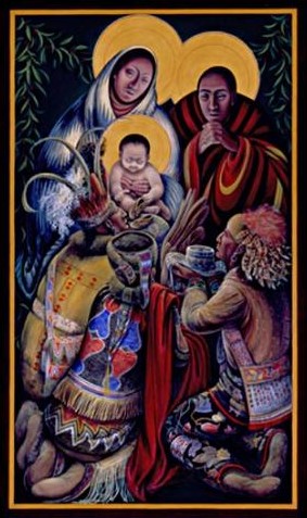 This is Fr. John Giuliani’s depiction of the three wise men as members of the Iroquois, Fox and Huron — tribes from the East of North America — bestowing gifts of feathers, moccasins and a beaded stole.