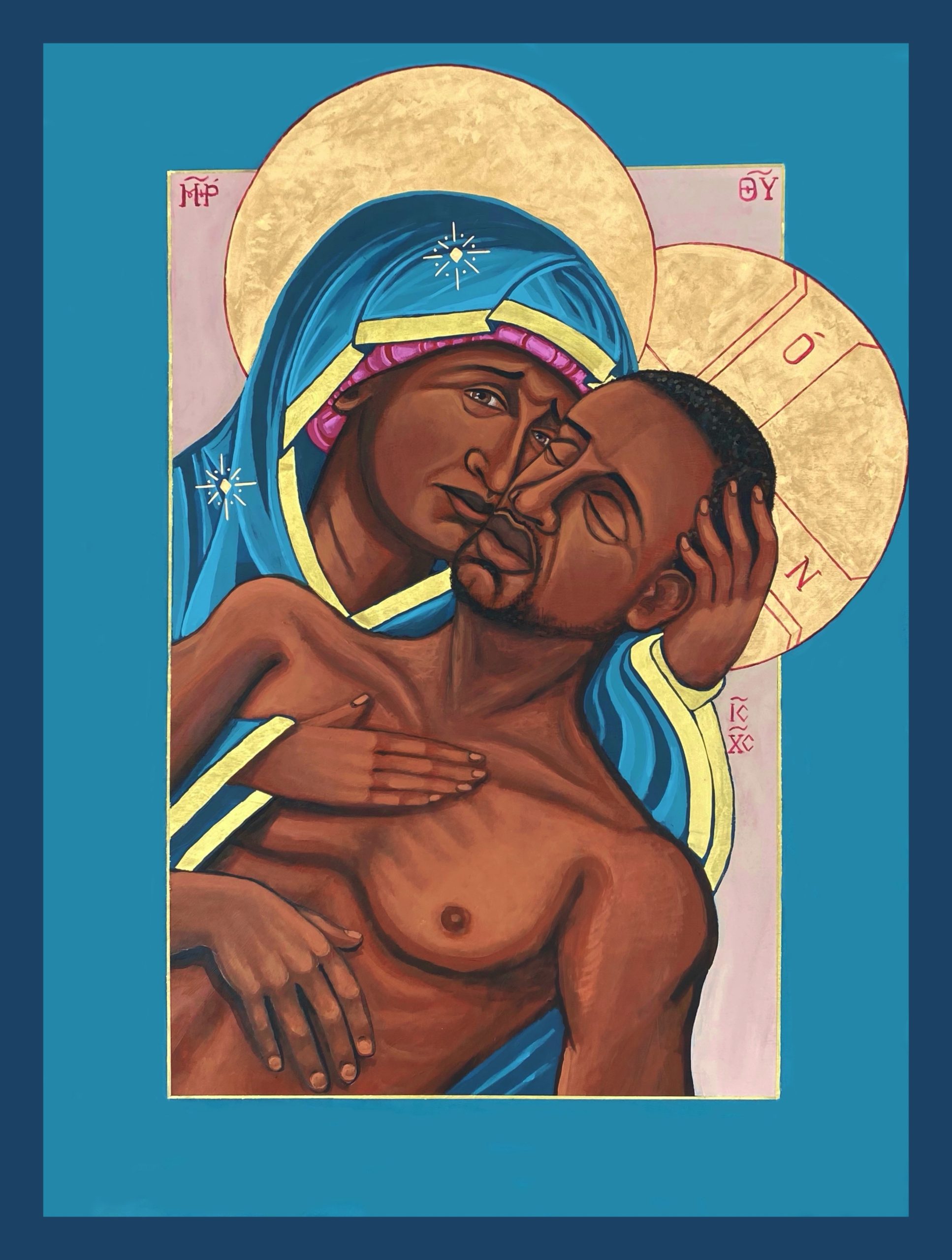 In this work, Mama, Mary’s grief is unmistakable. Yet this Pieta is unlike most we have seen. First, Jesus and Mary are depicted as Black. (While unfamiliar, it’s no more artistic license than is taken when Jesus is represented with blue eyes and light hair.) Second, Mother Mary’s gaze is directed at us, not at her son or heavenward. To me, it makes the Virgin’s anguish all the more real, more relatable. Her eye contact with the viewer also invites us to unite our own sorrows and longings with hers and with each other’s. In so doing, Mary’s gaze guides us, as the artist has remarked, to “communal thought and prayer and action”. The focus is not on Jesus’s death, then, so much as on what hope is born of it, on what comes next, on how we can be Jesus’s hands and feet.