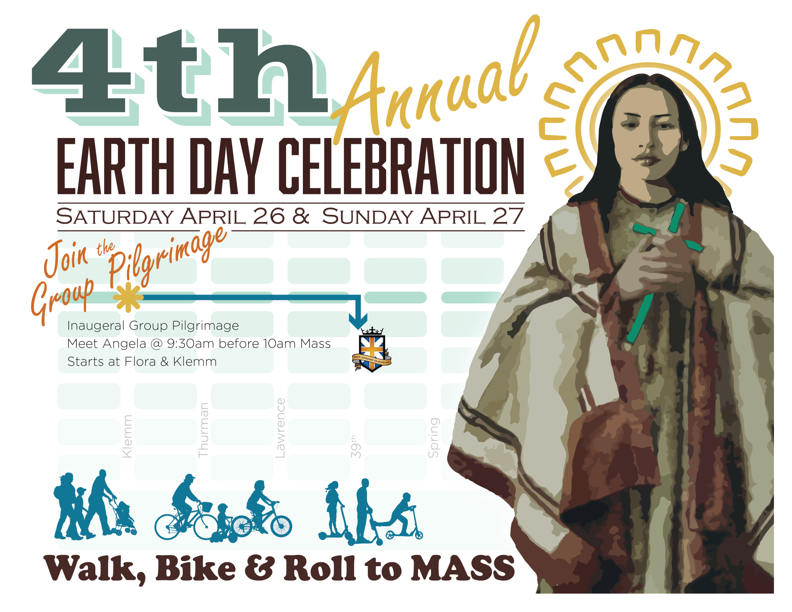 St. Margaret of Scotland will celebrate the 4th Annual Earth Day Celebration during the weekend of April 26th and 27th. Walk, bike, or roll to mass with family and friends, or join Angela Wildermuth at 9:30am at the intersection of Flora & Klemm for the inaugural group pilgrimage to the 10am mass. The group will walk Flora Place median park stopping to reflect and pray together. When you arrive at the church, the Living Justice Ministry’s Creation Team will greet you near the corner of 39th & Flad with a pin, which you will place on a map of the parish to mark the location where you started your pilgrimage.