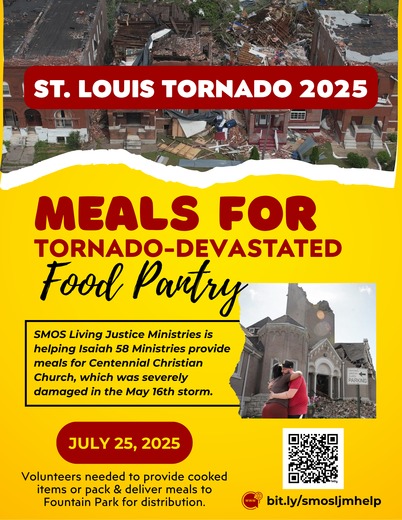 Living Justice is continuing to organize dates to help Isaiah 58 Ministries provide meals for those affected by the May 16th tornado. The next date scheduled is Friday, July 25th.