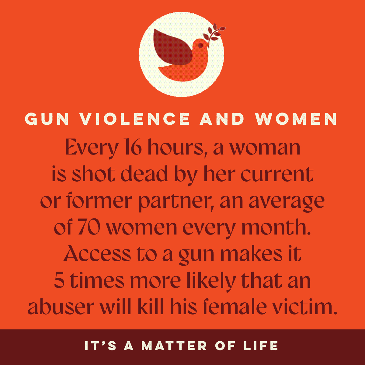 When it comes to gun violence, women in the United States are 28 times more likely to die by firearm homicide than women in peer high-income nations. Two in five female firearm homicide victims were killed by a current or former intimate partner. In other words, every 16 hours, a woman is shot dead by her current or former partner, an average of 70 women every month. Access to a gun makes it 5 times more likely that an abuser will kill his female victim.
