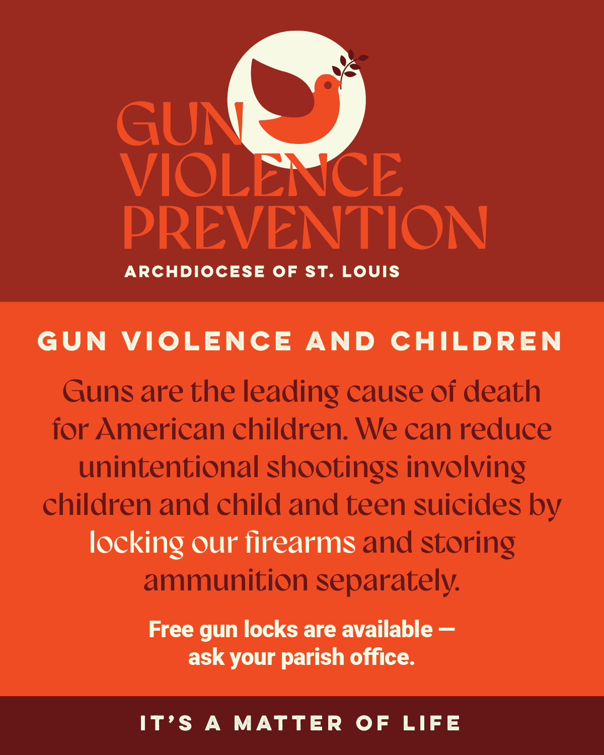 In recognition of Gun Violence Awareness Month, the Archdiocese of St. Louis Gun Violence Prevention Task Force has made free gun locks available at all parishes. Check with the parish office if you would like a lock or email GVPTF@archstl.org.