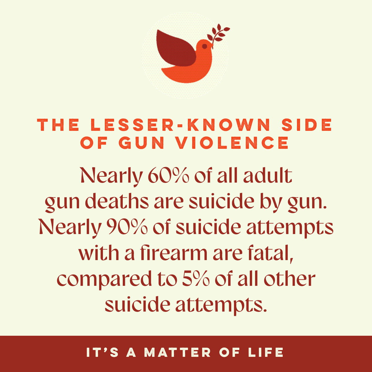 Most people are surprised to learn that well over half of all adult gun deaths are suicides by gun. The dynamics of suicide are complex, but research indicates that a combination of several risk factors is often present in the lead-up to suicide. One of those risk factors is access to lethal means of harm. Nearly 90% of suicide attempts with a firearm are fatal, compared to 5% of all other suicide attempts.