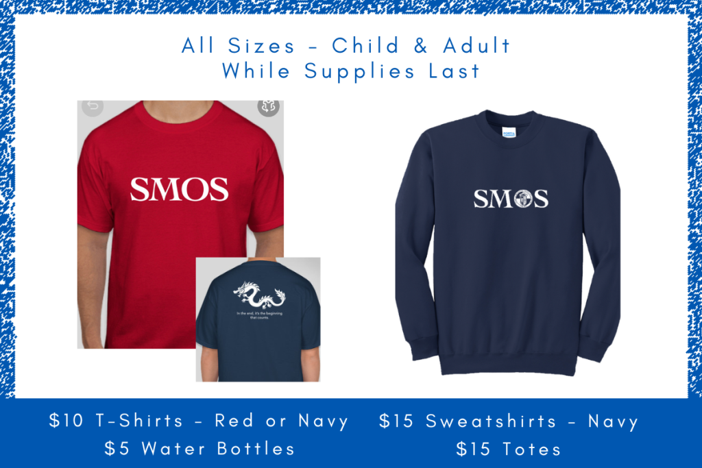 The PTA will be selling red and navy basic tee shirts (good for Spiritwear Fridays) and navy sweatshirts (which are uniform compliant), as well as water bottles and tote bags. We even have a small batch of “vintage” one-of-a-kinds we’re selling off for $1 each.
