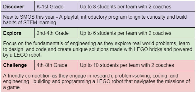 Lego Robotics will be firing up again soon for the 2023-2024 season. But first they need coaches! Check out this super-helpful info about this extracurricular afterschool program for SMOS students – and then click the link below to fill out the volunteer interest form.