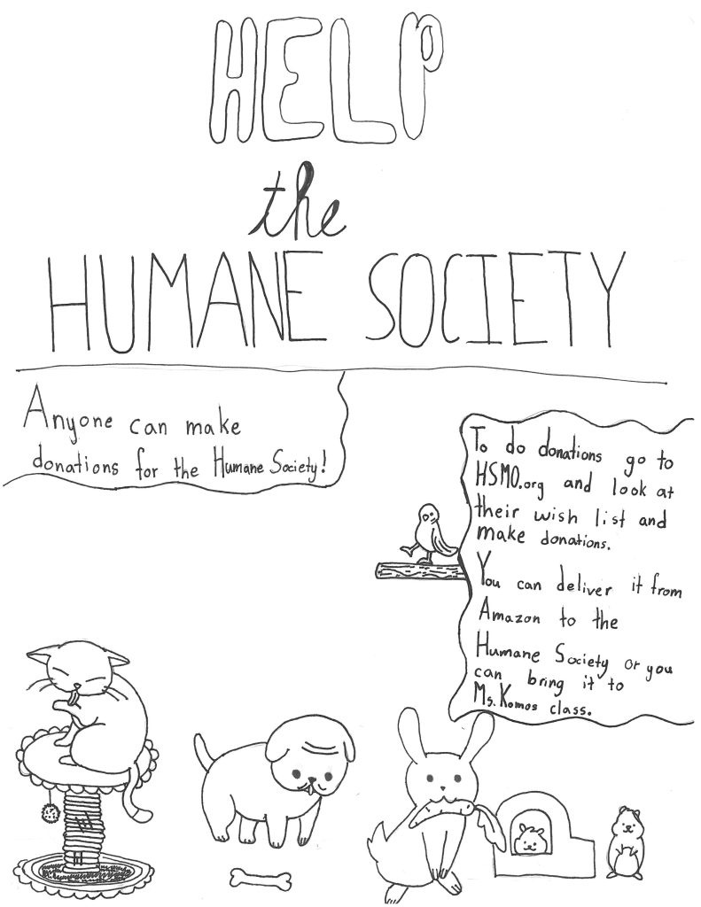 The 5th Grade Class wanted to do a service project this Fall – so they came up with a nice idea to help animals, and even created their own marketing. Thank you in advance for your generosity – any donations can be made at hsmo.org.