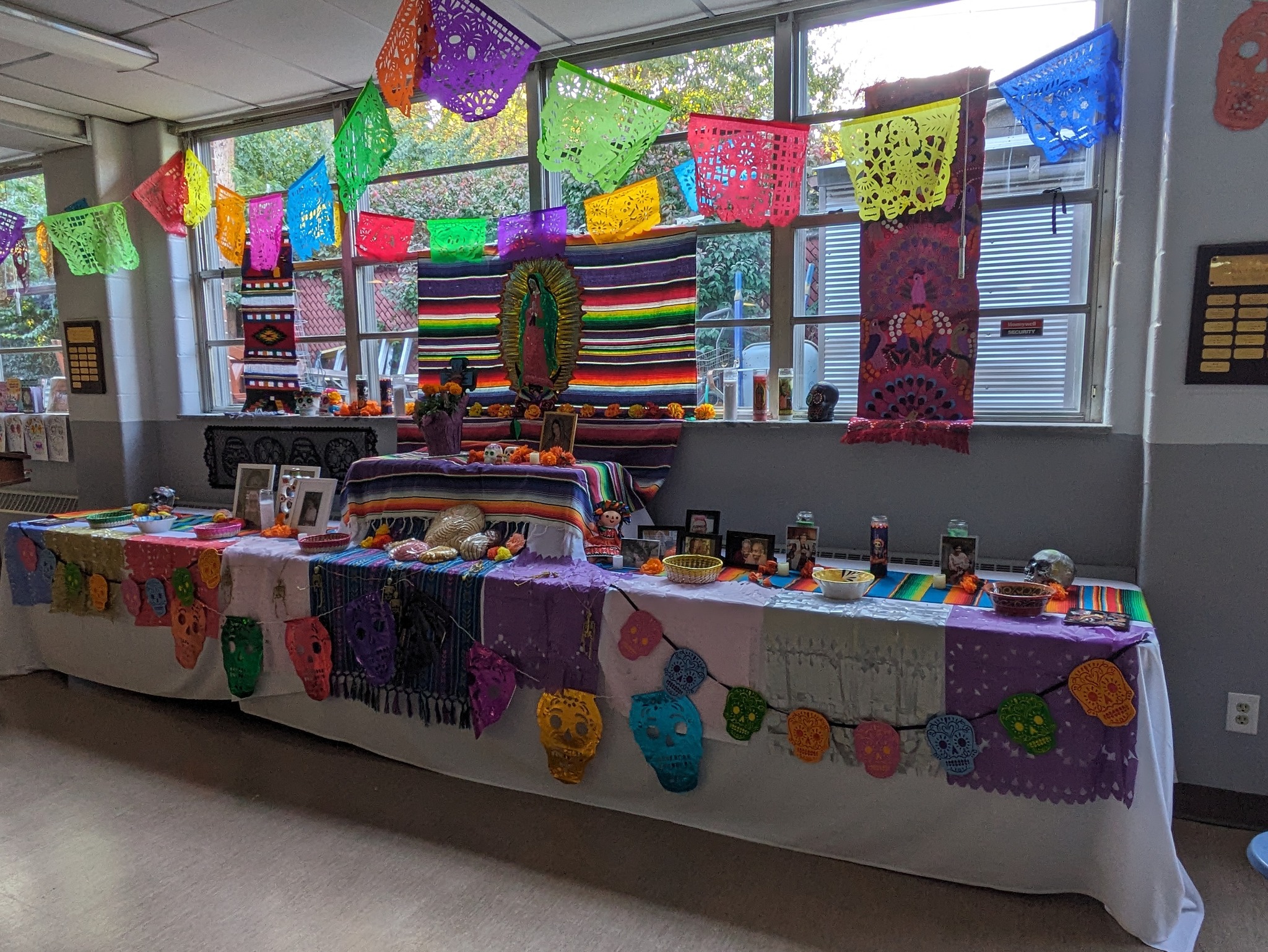 Our community Día de los Muertos ofrenda is up in the cafeteria! ALL are welcome to participate. Families and student(s) can choose to bring personal things to place on the altar. Ideas of appropriate items include photos (or drawings!) of loved ones or pets that have passed on, photos of Saints, a rosary or cross, favorites items of the deceased (fruit, trinket, toy, candy, etc.). While not required, we love receiving photos in tabletop frames so they are easy to display.