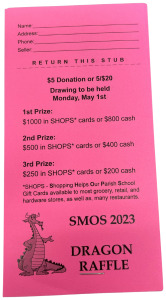 Here are the prizes if you win the Dragon Raffle: 1st Prize – $1,000 in SHOPS cards or $800 cash; 2nd Prize – $500 in SHOPS cards or $400 cash; 3rd Prize – $250 in SHOPS cards or $200 cash. (SHOPS stands for Shopping Helps Our Parish School – they’re gift cards that are available to most grocery, retail, and hardware stores, as well as many restaurants.