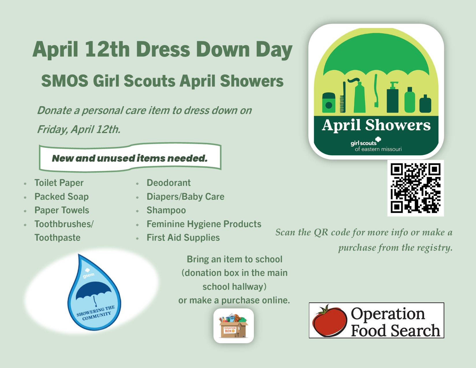 The Girl Scouts are sponsoring a Dress Down Day to coincide with their April Showers collection event on Friday, April 12. Students can wear appropriate “out of uniform” dress when they donate a personal care item or make a donation online.