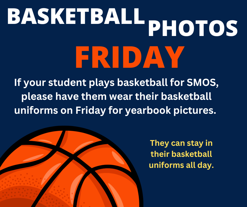 Don’t forget to have your student wear their basketball uniform to school tomorrow, Friday, February 28, 2025, if they played hoops for SMOS! The yearbook team will be on hand to photograph all of the teams. Students are allowed to wear their jerseys all day afterward.