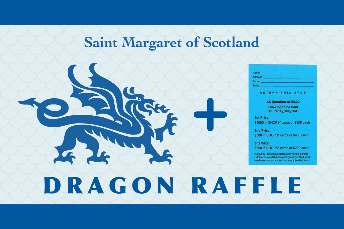 Here are the prizes if you win the Dragon Raffle: 1st Prize – $1,000 in SHOPS cards or $800 cash; 2nd Prize – $500 in SHOPS cards or $400 cash; 3rd Prize – $250 in SHOPS cards or $200 cash. (SHOPS stands for Shopping Helps Our Parish School – they’re gift cards that are available to most grocery, retail, and hardware stores, as well as many restaurants.)