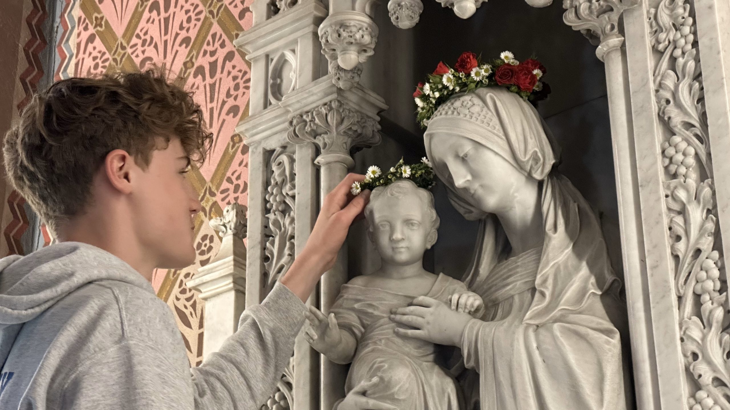 May is traditionally known as Mary’s month, so the student body took a moment on Wednesday, May 7th, before the All-School Mass began to do a May Crowning service. Mary is Queen of Heaven and Queen of All Saints, so representatives from the 8th grade class placed a crown on her head as a visual remembrance of these beliefs. They also placed flowers in front of the statue to decorate the altar as well.
