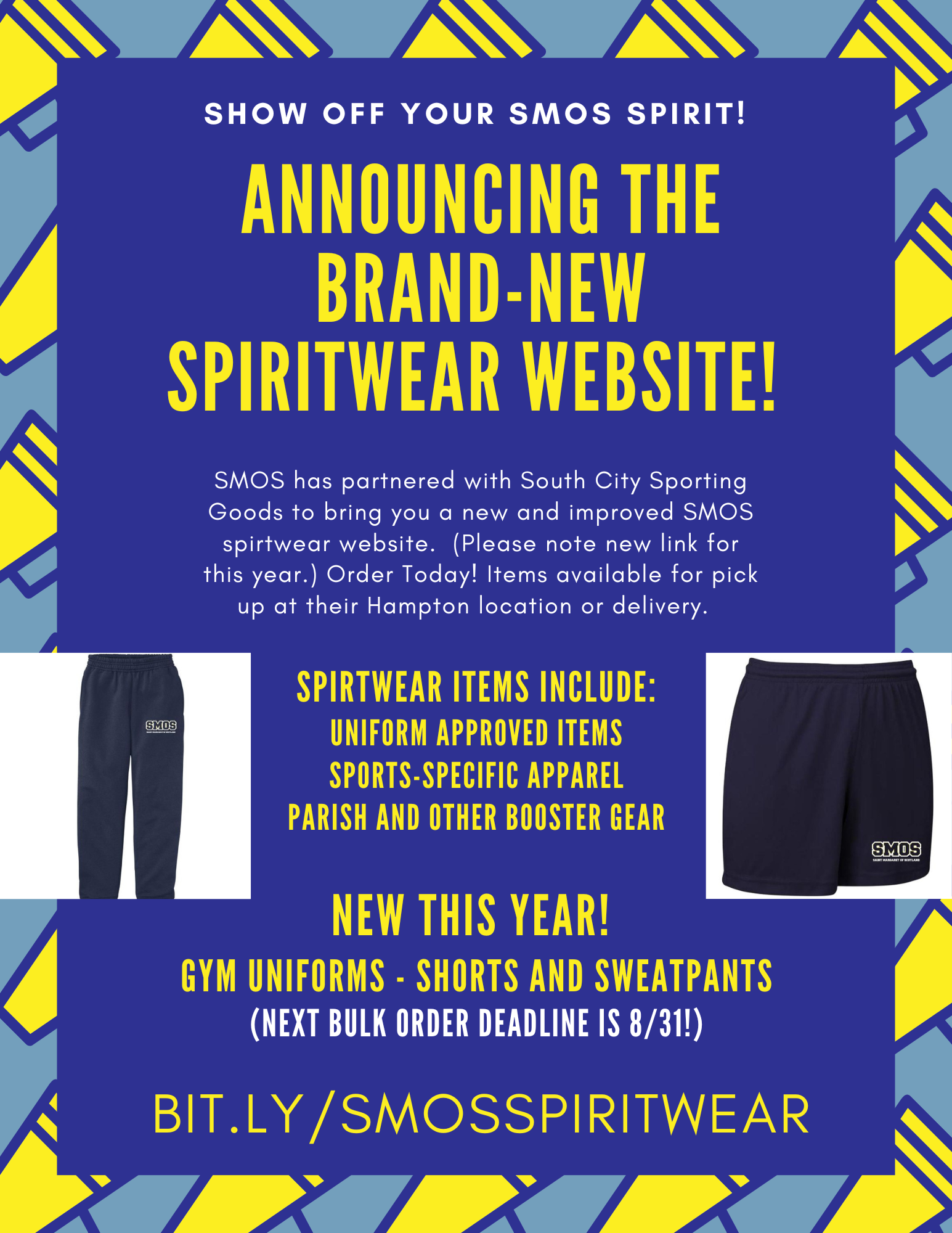 New SMOS Spiritwear is available for the 2025-2026 school year. The SMOS PTA has partnered with local vendor South City Sporting Goods to bring parish and school families some exciting new options, along with traditional “uniform-approved” gear as well.