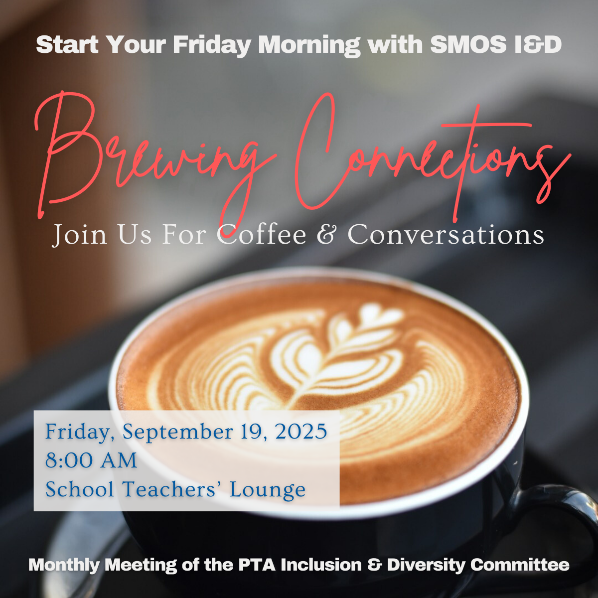 Join the SMOS PTA Inclusion & Diversity Committee on Friday, September 19 at 8:00am in the Teacher’s Lounge for “Brewing Connections” – a chance to talk all things I&D with parents, staff, and parishioners.