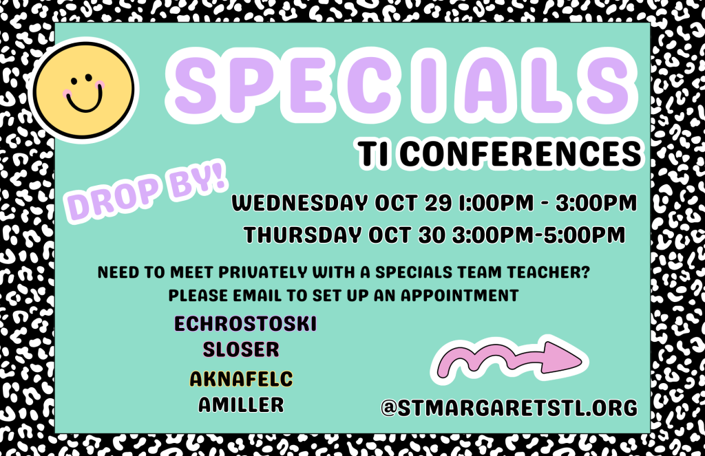Parent-Teacher Conferences for ALL FAMILIES are on Wednesday, October 29 from 1-7 p.m. and Thursday, October 30 from 3-7 p.m.