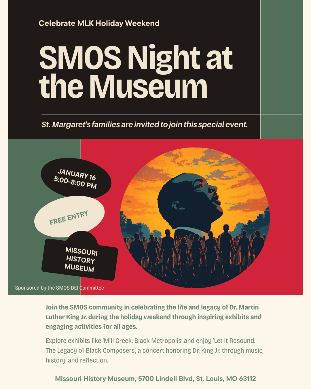 Join us for a special evening at the Missouri History Museum as part of its monthly nighttime series. This is a wonderful opportunity for SMOS families to gather, explore, and celebrate together. All current exhibits will be open, including Mill Creek: Black Metropolis, which explores the vibrant history of this once-thriving Black neighborhood and its lasting significance in St. Louis history.